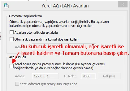Alt kısımda görülen Yerel Ağ Ayarlarını tıklayın. Açılan pencerenin alt kısmında kutucuk işaretli ise bunu kaldırıp tamam deyin. Tarayıcınızı aç kapa yapın. Sorun çözülmüş olur.
