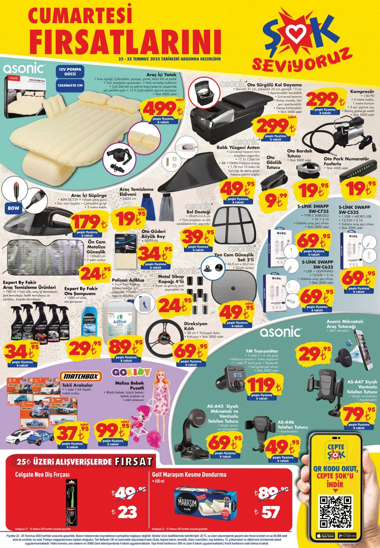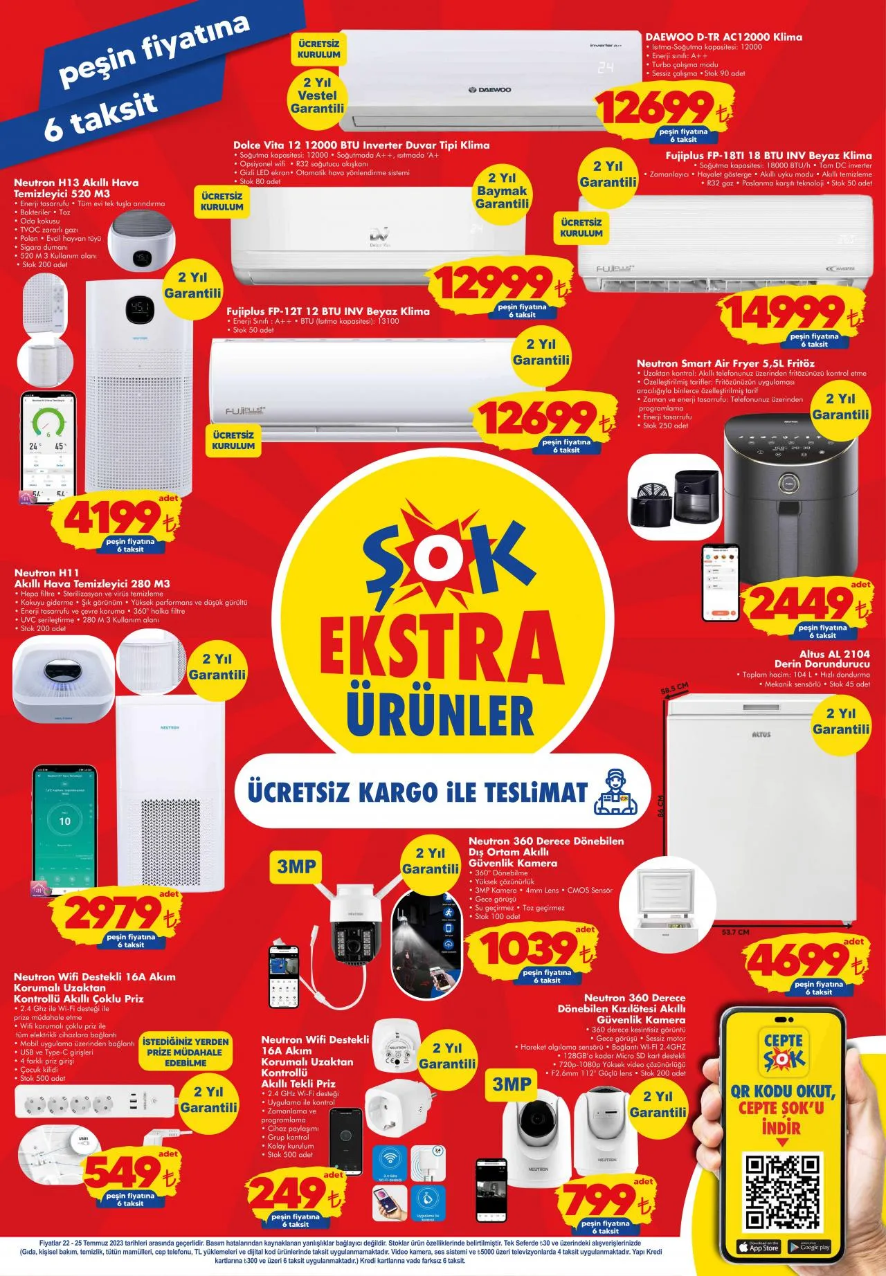 ŞOK 22 Temmuz ile 25 Temmuz 2023 tarihleri arasında geçerli olacak aktüel ürünler kataloğunu yayınladı. Bu hafta ŞOK’ta araç bakım ürünleri, oto aksesuar ve elektronik ürünler raflarda yerini alacak. Ayrıca peşin fiyatına 6 taksit imkanı ile ev tipi klima çeşitleri, derin dondurucu, hava temizleyici cihazlar satılacak. İşte haftanın tüm ŞOK aktüel ürünleri…